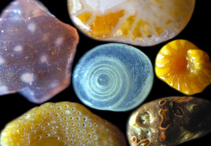 Sand composition can vary drastically depending on where it’s located. The coastal sands in Hawaii, where Dr. Greenberg is located, are very likely the subjects of his amazing micro-photography. The sand in his images is full of remnants from various tropical sea organisms large and small. The sand on other coasts, depending on the temperature, surf conditions and marine environment, may include a totally different set of rocks, minerals and organic matter.