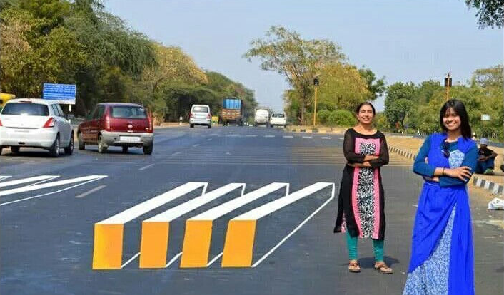 The 3-dimensional zebra crossing gives an illusion to oncoming drivers that it is a blockade, hence making them slow down. The novel idea will be used near schools and accident prone areas in Ahmedabad to reduce road related accidents and allow pedestrians to safely cross the road.